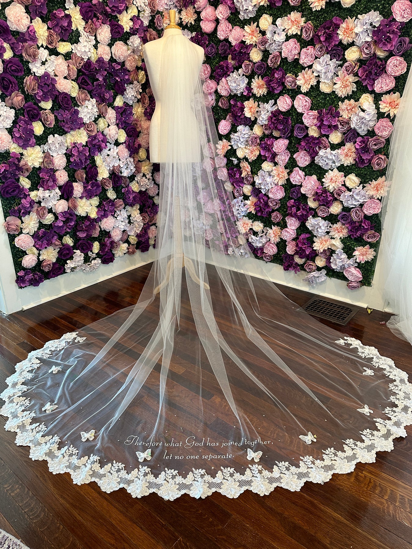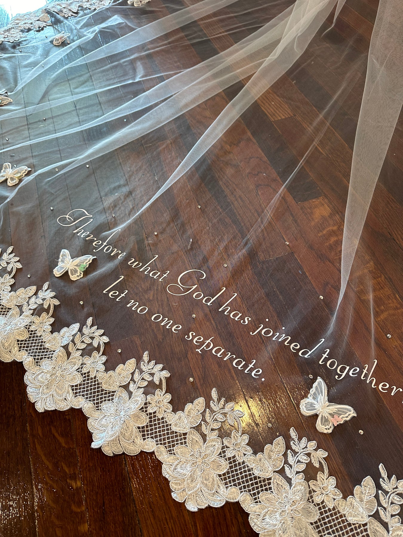 Beside the Bible Verse, the veils has delicate floral lace around the bottom curve, while hand-placed butterflies and shimmering rhinestones add the perfect touch of sparkle. This veil beautifully captures your heart and soul on your special day, creating an unforgettable moment as you say "I do."